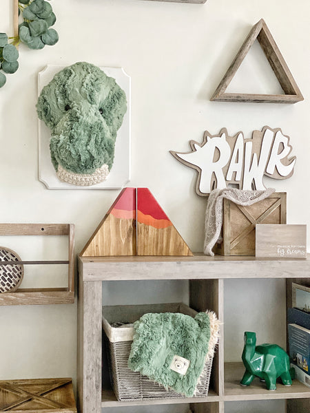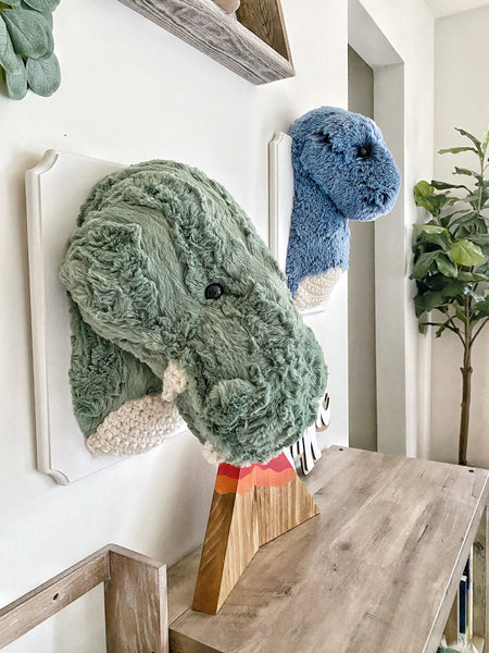 Create a dinosaur adventure in your home with our T-Rex Wall Mount! This ClaraLoo plush Tyrannosaurus Rex Wall Mount is made with soft green textured faux fur. This charming stuffed dinosaur has crocheted teeth and a crocheted chest. This unique plush T-Rex rests on a wooden plaque that has been painted white. Mounting hardware is already installed on the plaque. This handmade treasure is the perfect wall decor for a dinosaur themed nursery or big kid bedroom.