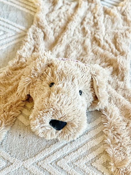 Plush Dog Rug - Golden Retriever. This ClaraLoo Puppy Dog Rug is made with tan faux fur that is lined with flannel fabric. He has a stuffed head and a crochet collar.
