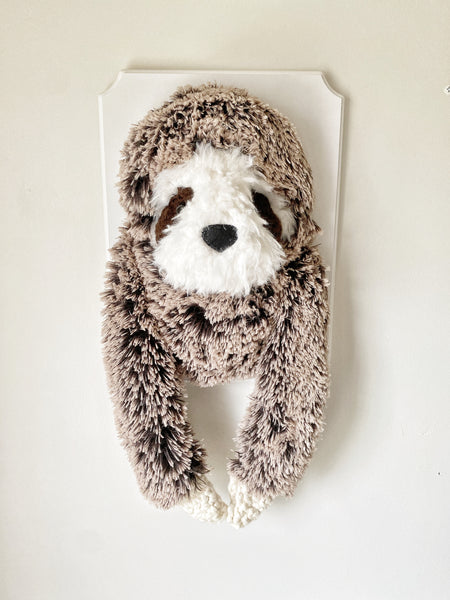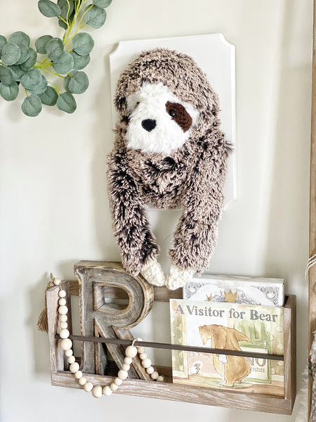 Create a jungle adventure in your home with our Sloth Wall Mount! This ClaraLoo Sloth Wall Mount is made of plush brown and white faux fur with crocheted eye patches and crocheted hands. This charming and unique stuffed sloth rests on a wooden plaque that has been painted white. Mounting hardware is already installed on the plaque. This handmade treasure is the perfect wall decor for a jungle, woodland, or forest themed nursery or big kid bedroom.