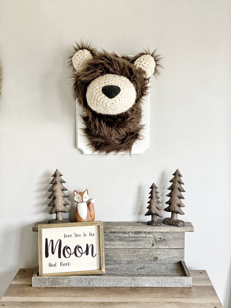 ClaraLoo Animal Wall Mounts are made with faux fur, polyester stuffing, yarn, felt (for some of the animals), and a wooden plaque.
