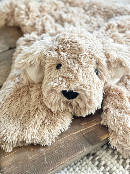 ClaraLoo Puppy Dog Lovey. This is a double-sided faux fur puppy dog lovey with a stuffed head.