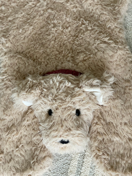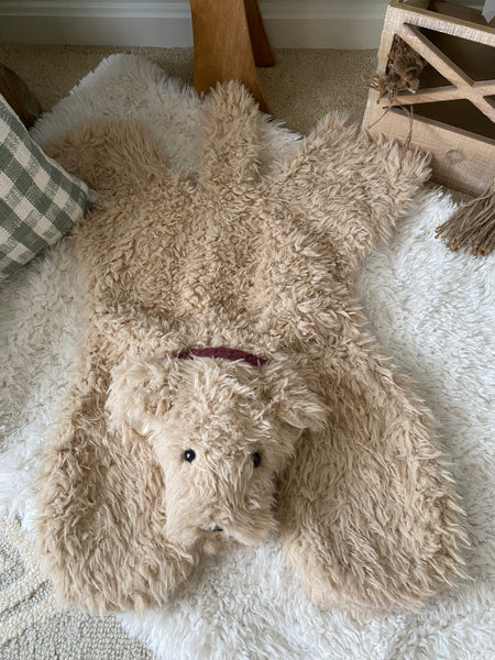 I know this product is intended as a rug, but I bought it because he looks like my beloved dog, Beeper, who was killed by a hit and run driver a couple months ago. I keep this guy on my bed and he reminds me of my Beeper. He is beautifully made, super soft and cuddly, and he brings me joy! #beepthesheep