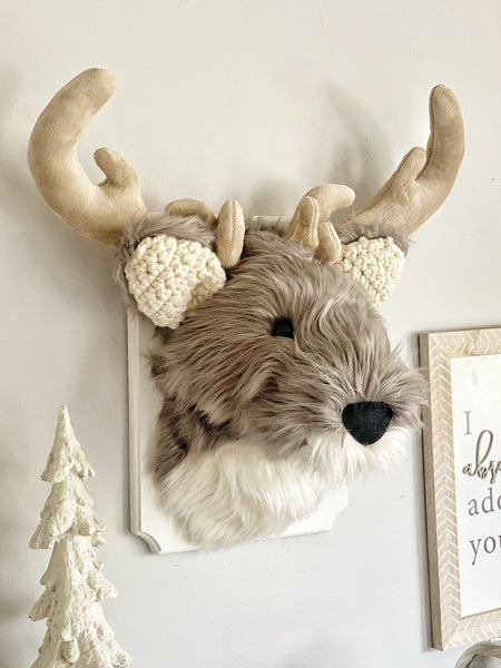 ClaraLoo Deer Wall Mount - The Deer Wall Mount is made of cappuccino or gray faux fur with ivory accents and crochet ears. He rests on a wooden plaque that has been painted white. Mounting hardware is already installed on the plaque.