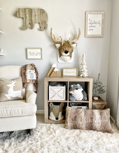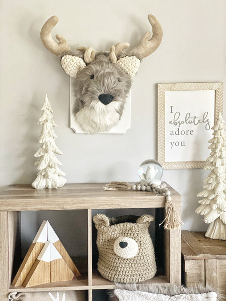 Elevate your woodland nursery with our handmade Deer Wall Mount. The plush faux fur adds a soft touch, while the crochet accents bring a charming handmade feel. Perfect for adding a playful and cozy atmosphere to your little one's nursery.